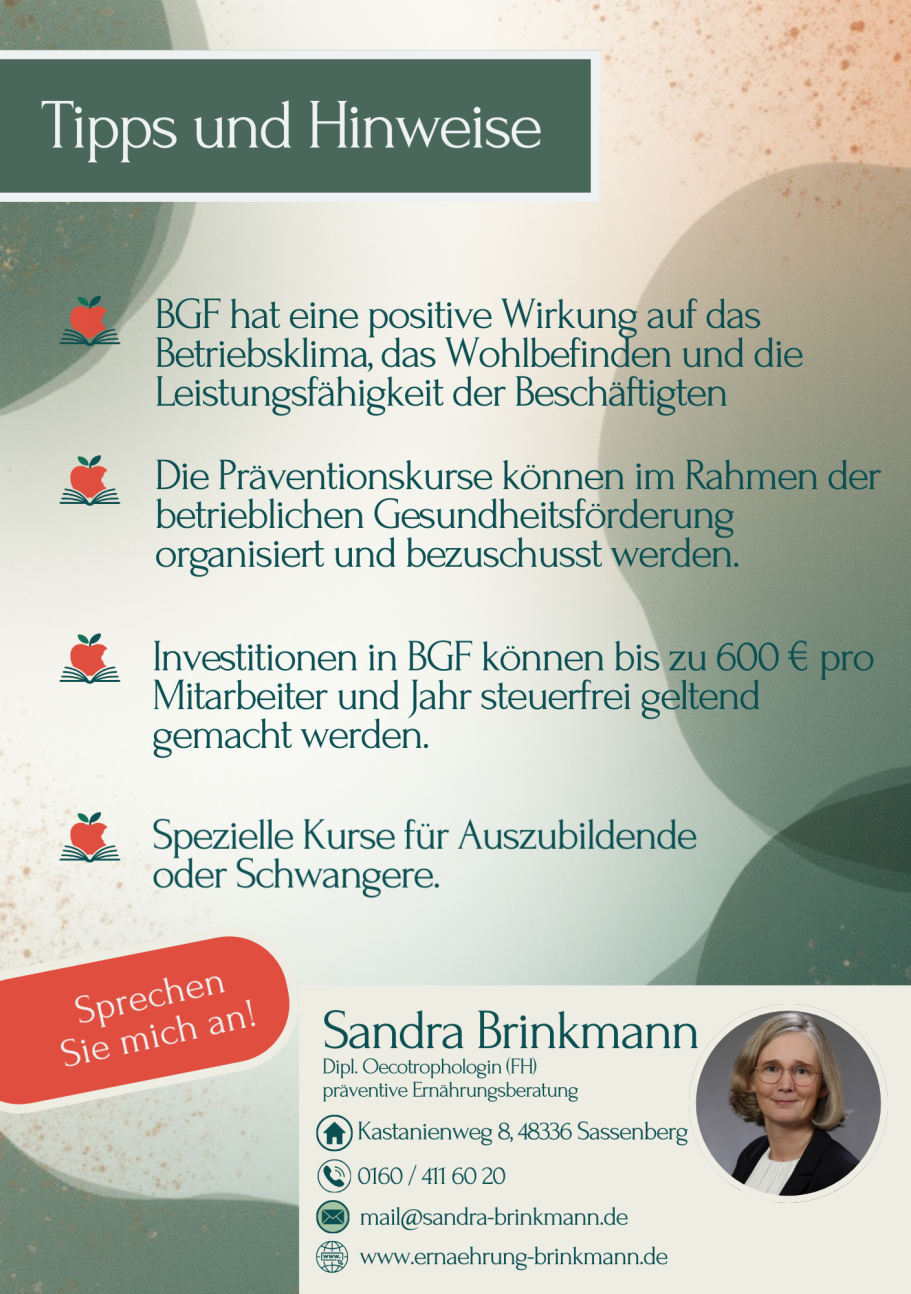 Die Wissensvermittlung zur gesunden Ernährung ist ein Gestaltungsbereich im Rahmen der BGF. Eine ausgewogene und vollwertige Ernährung und die Umsetzung im Alltag ist wichtig für das Wohlbefinden, das Leistungslevel und die Produktivität der Mitarbeitenden.